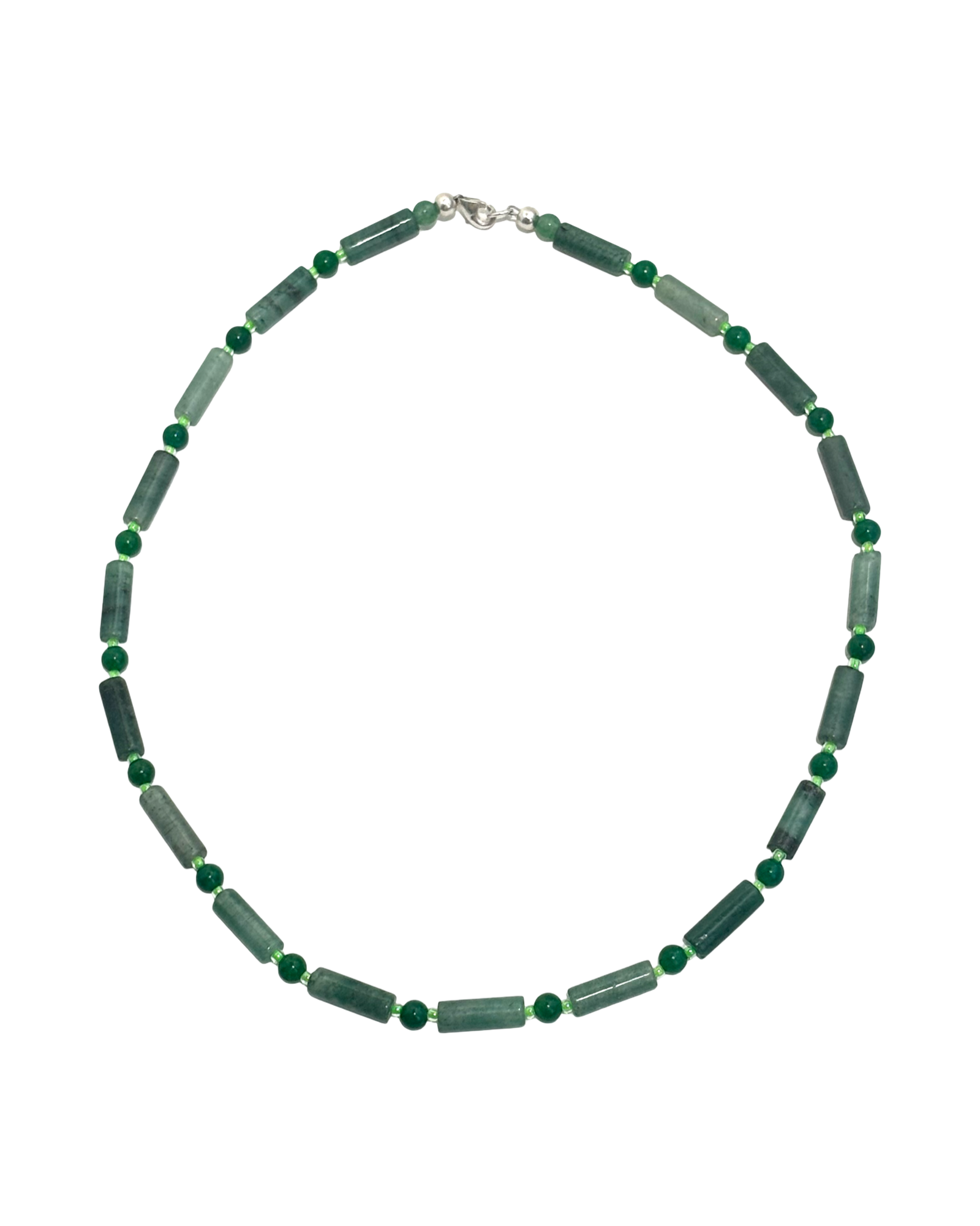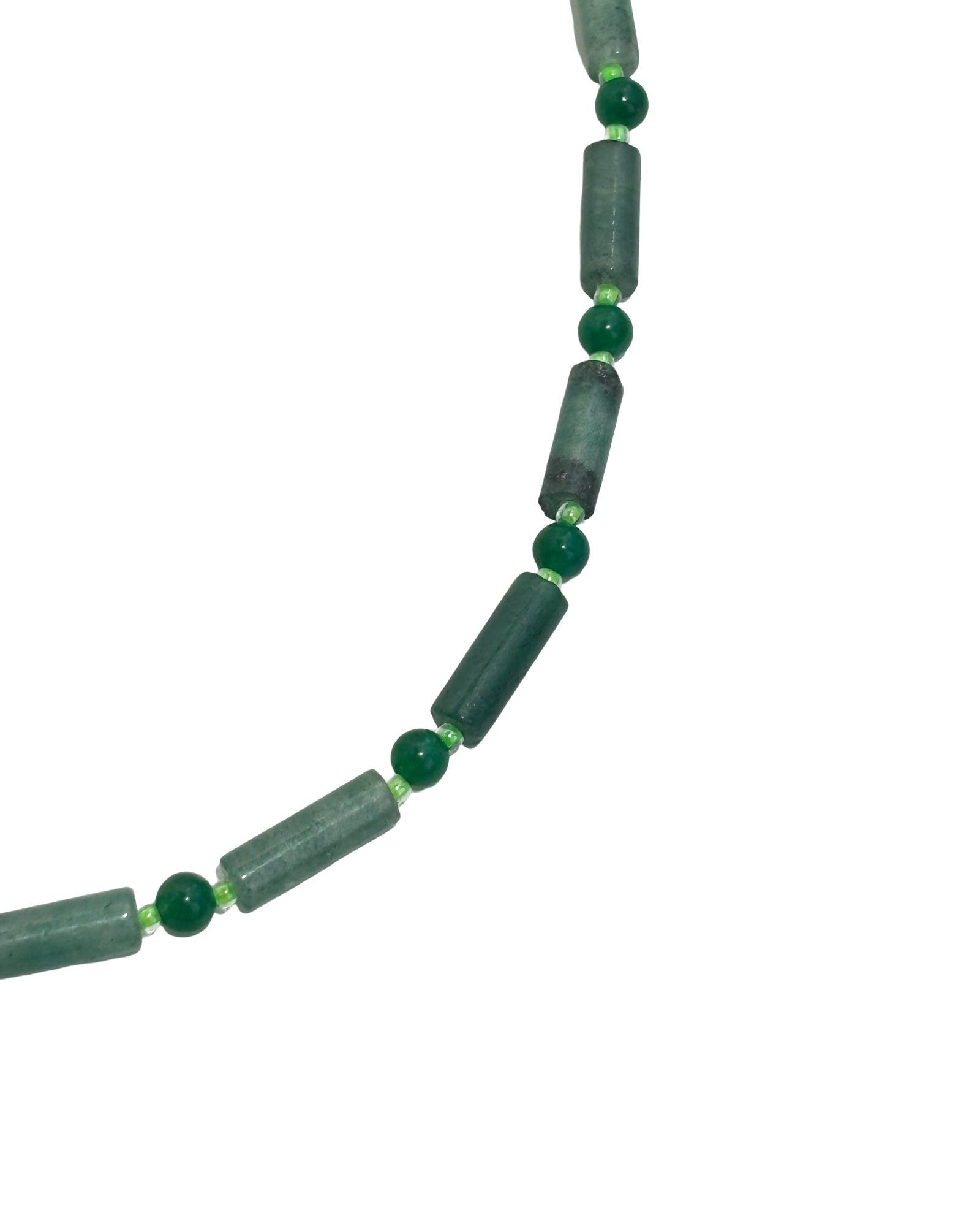 A sacred blend of grounding and growth, this necklace features elongated green aventurine beads paired with smooth jade spheres—inviting balance, abundance, and emotional harmony into your energetic field. The aventurine beads channel calm, forward motion, and opportunity, while the jade offers protection, heart-centered healing, and timeless wisdom.