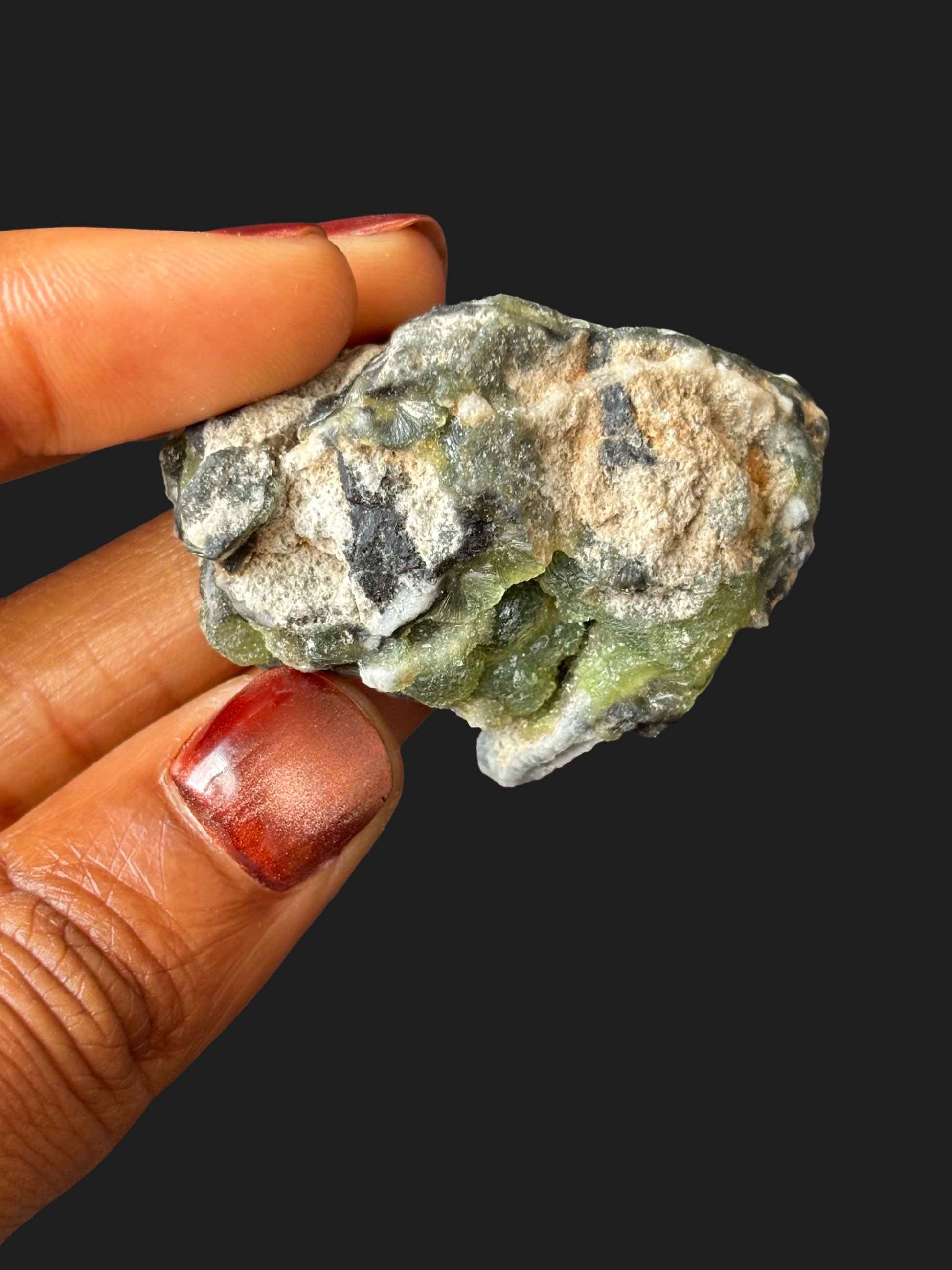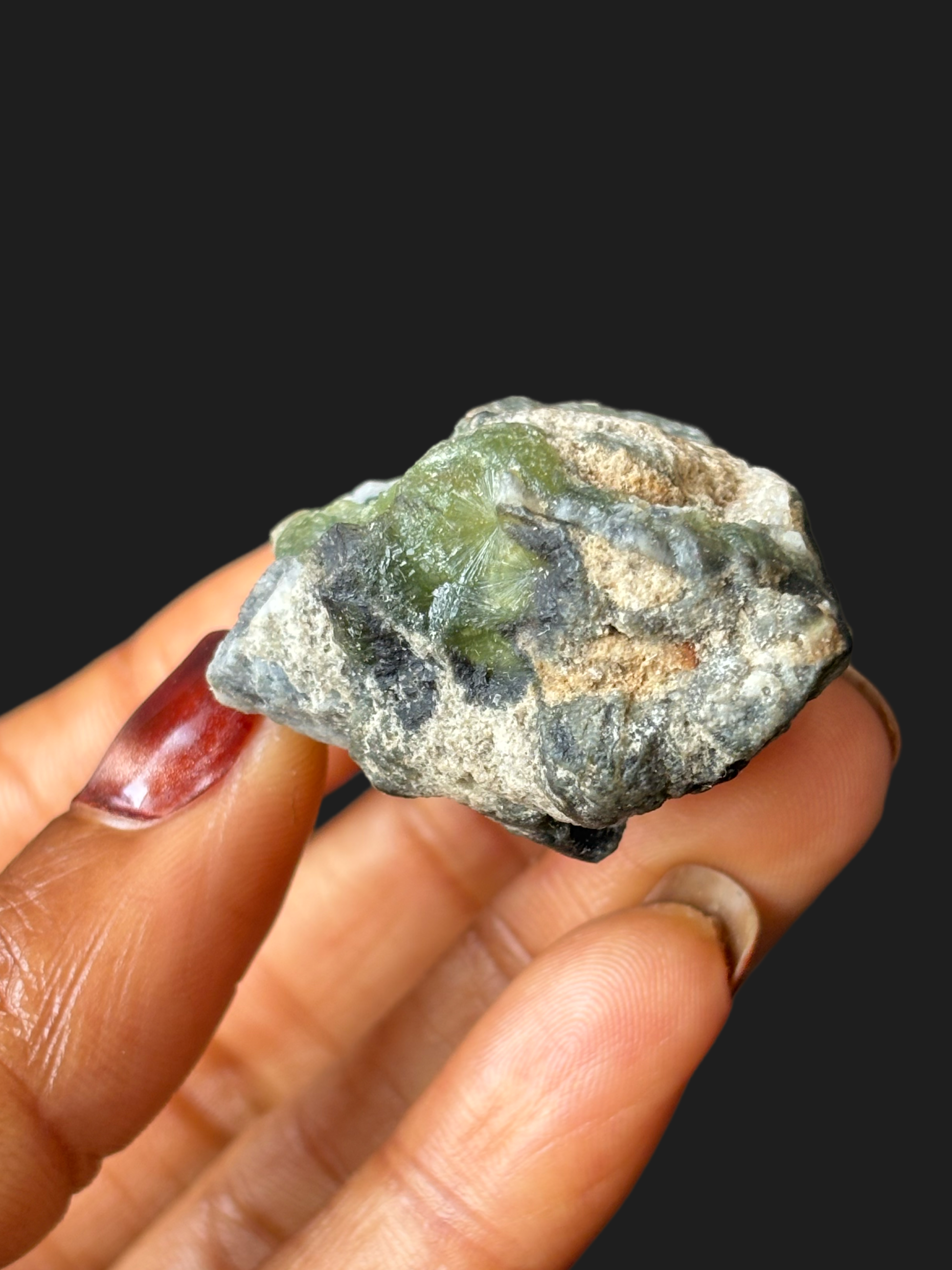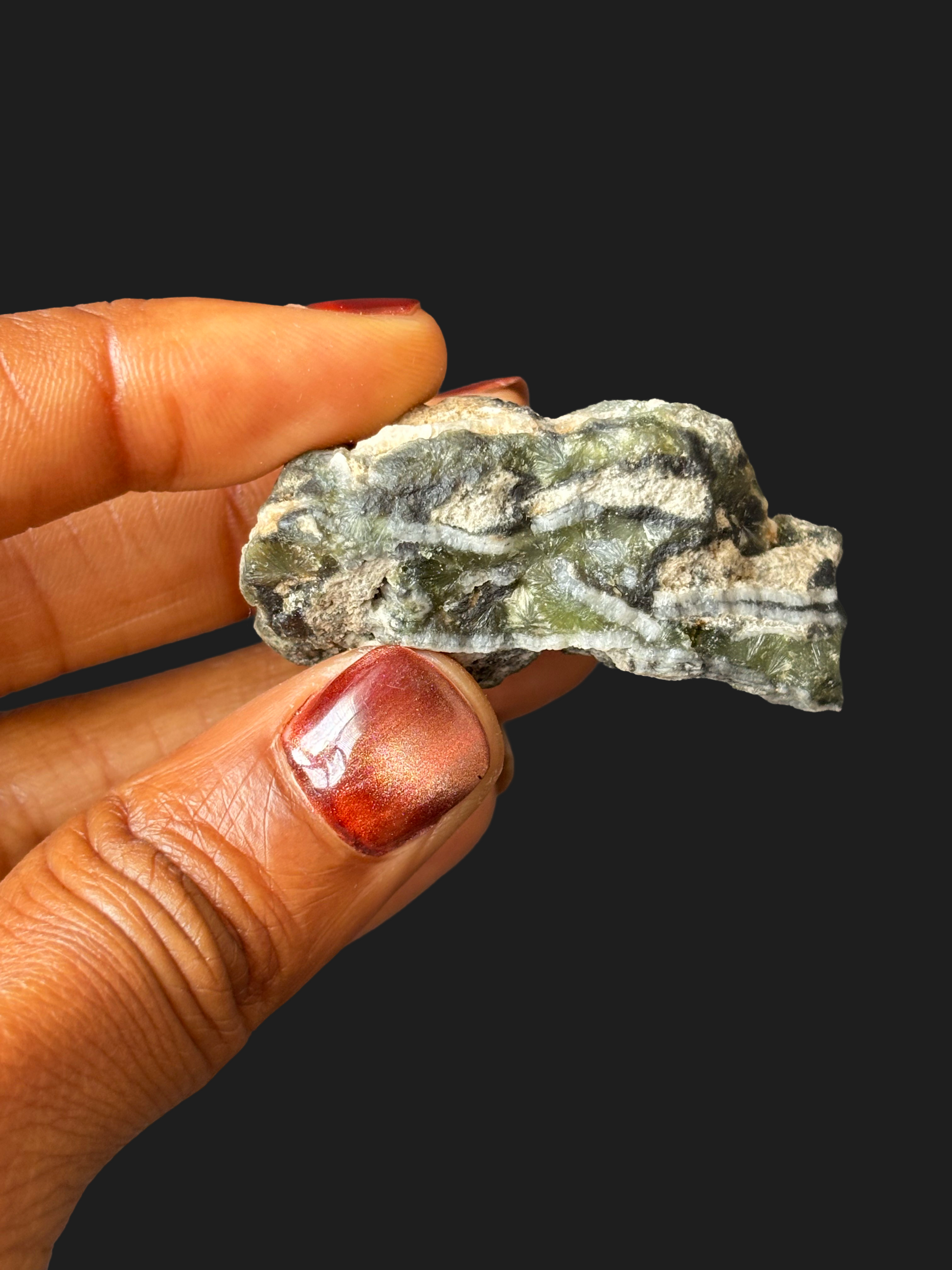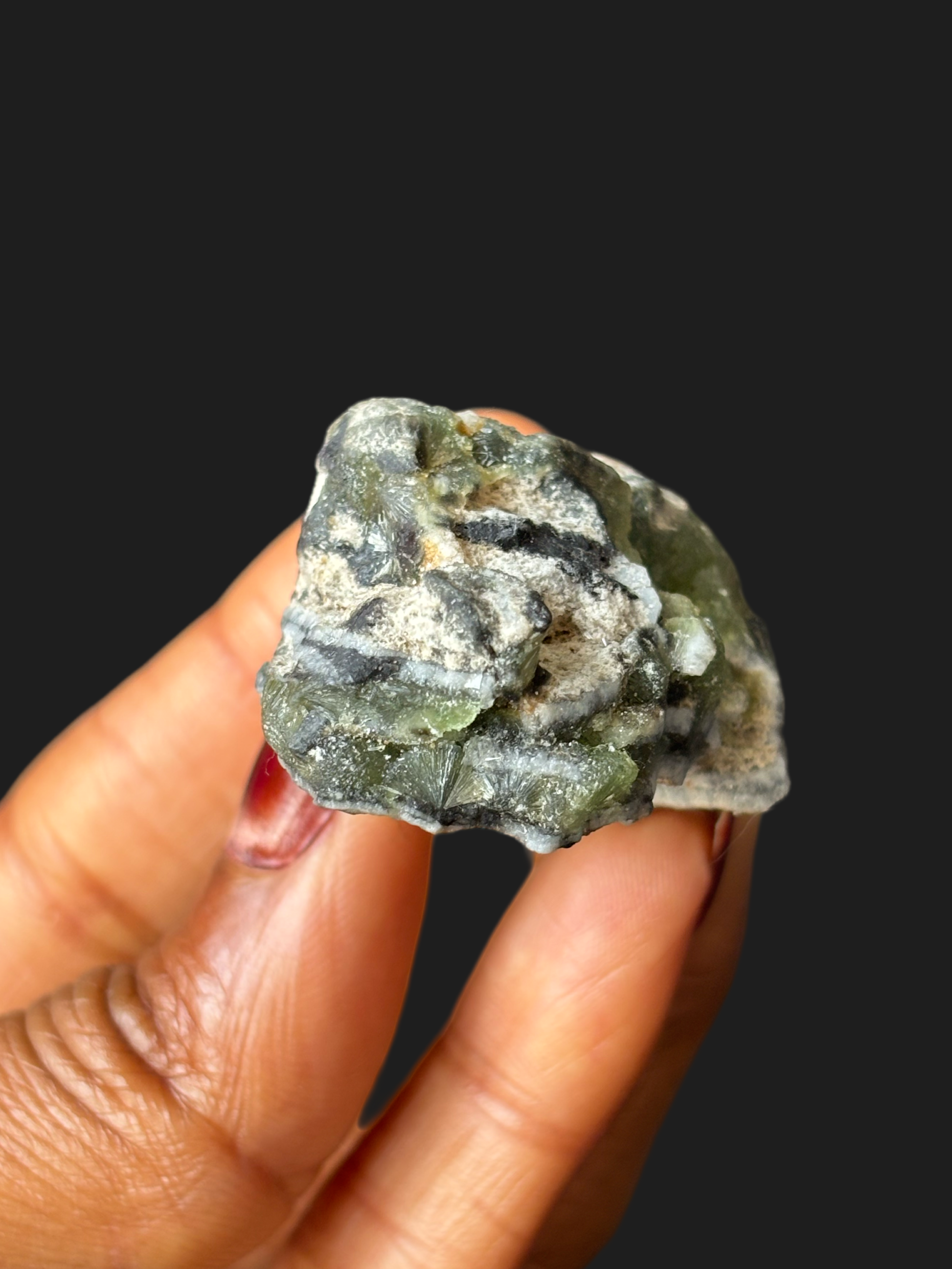 This unique specimen features rich green wavellite naturally nestled in a layered matrix. Distinct quartz veins run through the piece, adding shimmer and contrast to the earthy textures. This specimen carries both raw elegance and mineral depth — perfect for collectors, crystal lovers, or display.