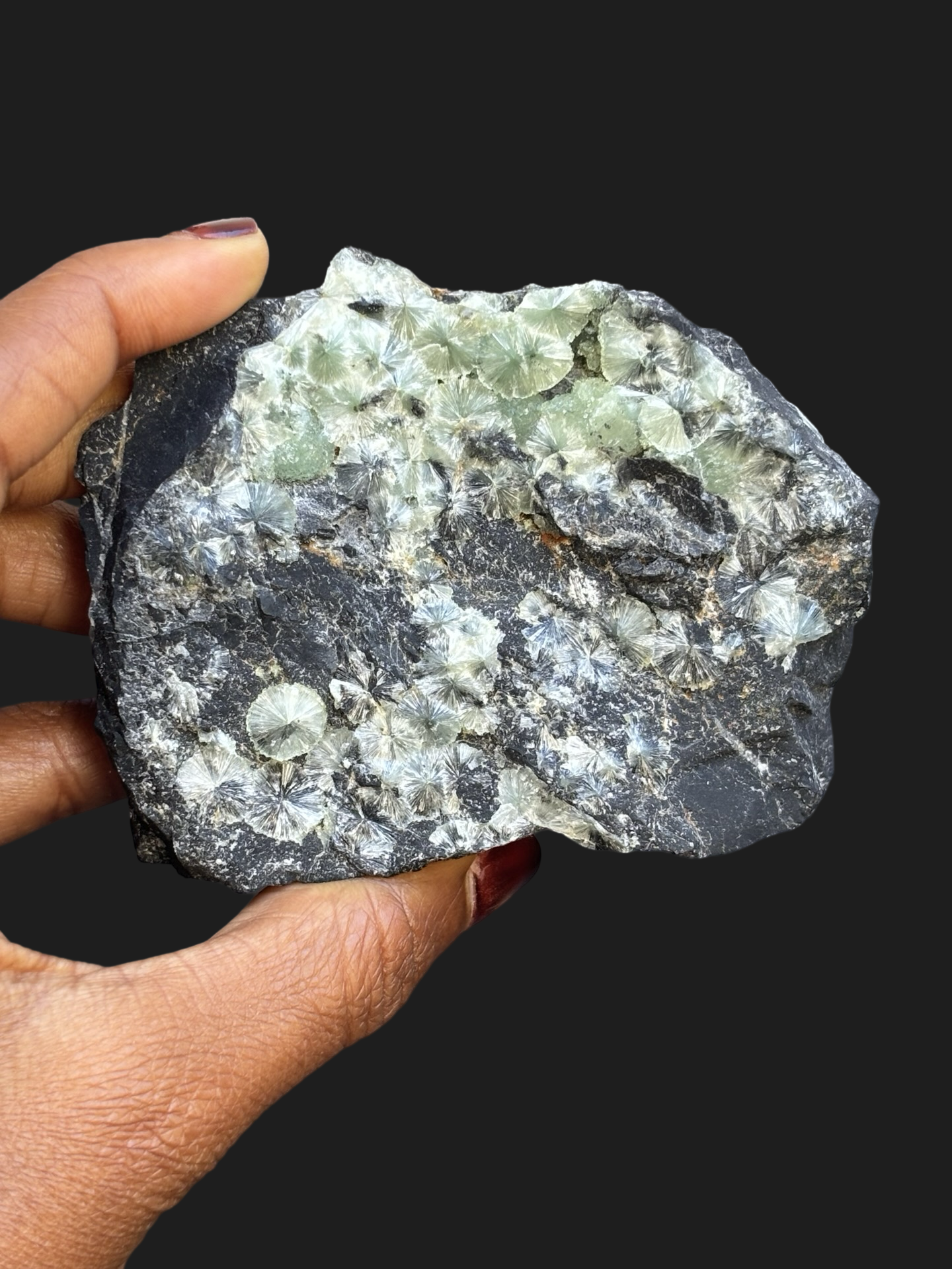 This striking wavellite specimen showcases a mesmerizing display of radiating cat’s eye formations across a rich novaculite matrix. Each crystal fan gleams with remarkable clarity and shimmer, creating a dazzling surface that catches the light from every angle. The wavellite itself exhibits a rare and delicate pale green hue with subtle blue undertones, adding an ethereal quality to its shimmering, fan-like formations.