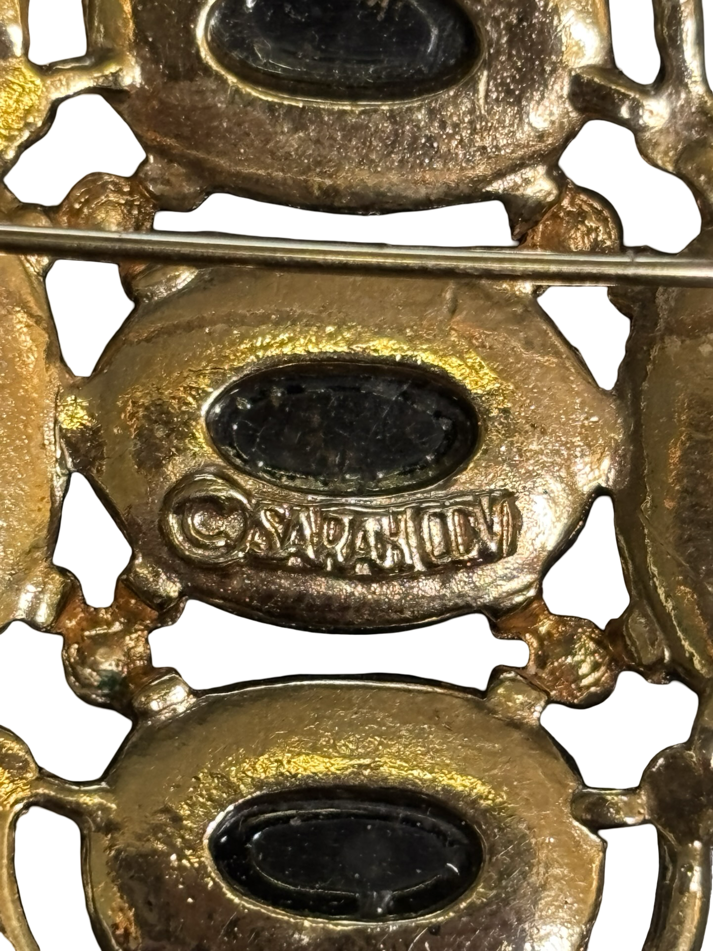 Crafted with Sarah Coventry’s signature attention to design, the brooch offers a sculptural presence that elevates coats, scarves, blazers, or dresses. The enamel remains vibrant, making this a standout collectible for lovers of Art Deco revival jewelry and classic 1960s accessories.