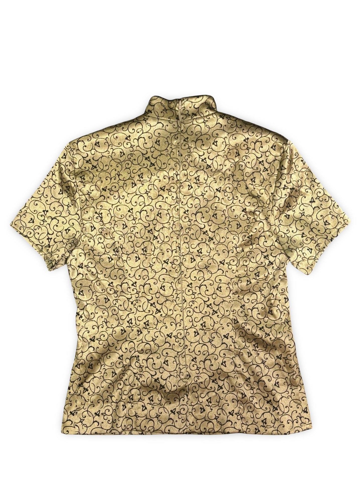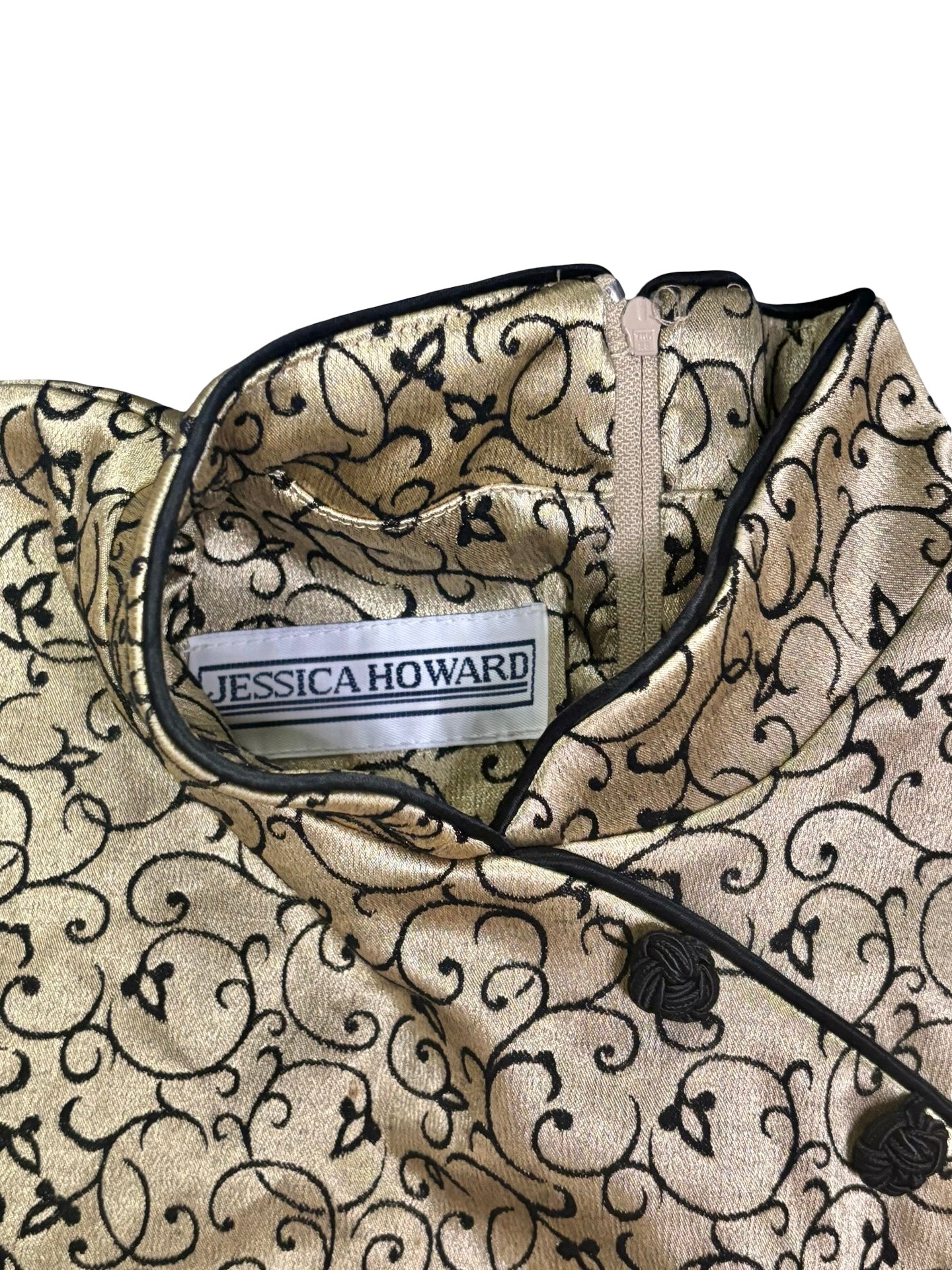 Elegant and eye-catching, this vintage 1980s Jessica Howard top is inspired by a cheongsam (qipao) silhouette, blending East-meets-West design with classic 80s glamour. The fabric features a shimmery gold base adorned with an intricate black curlicue pattern, creating a striking, luminous effect.