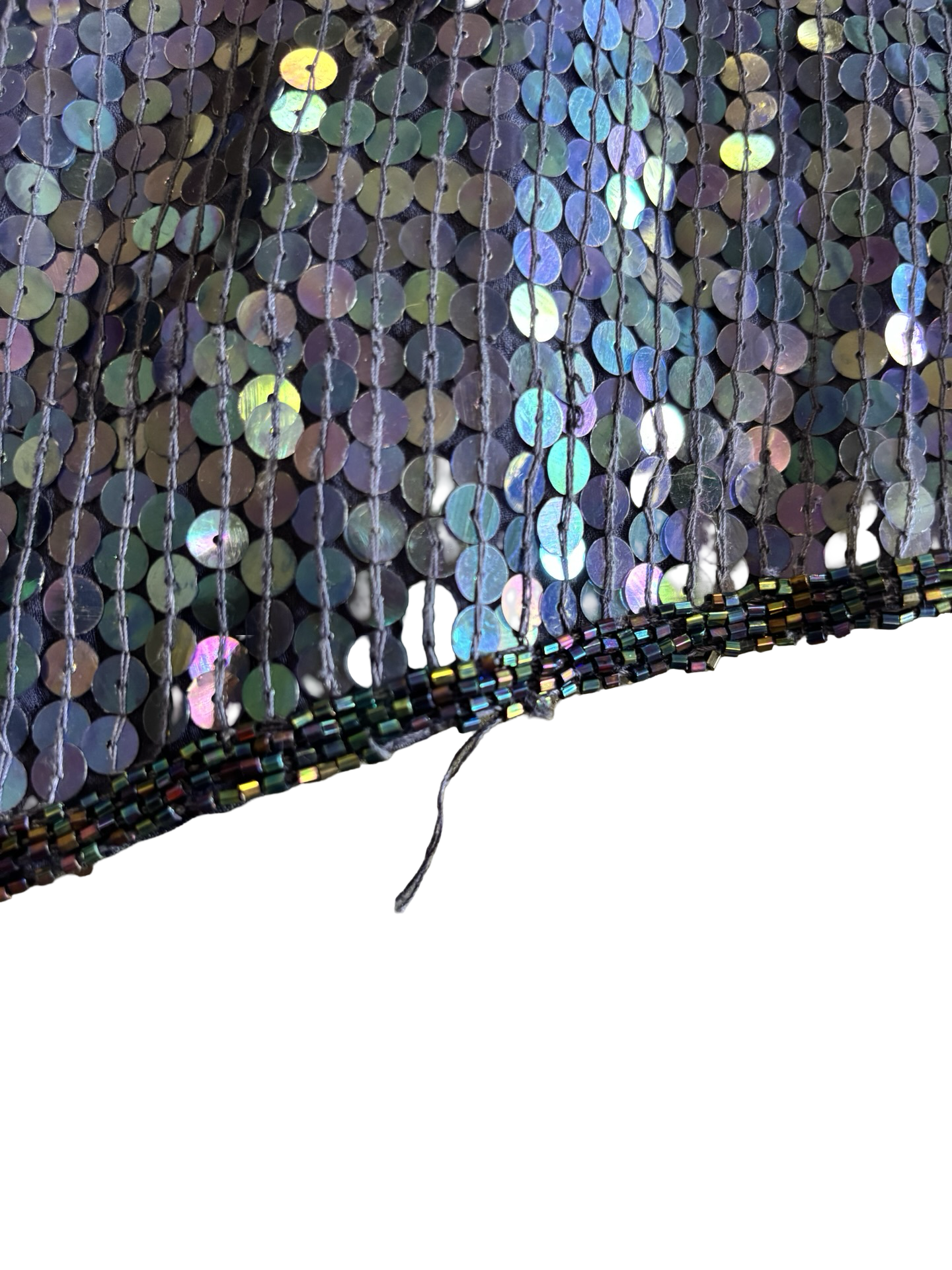- Condition: (9/10) Excellent Vintage Condition — Excellent vintage condition. There are small, barely noticeable areas of missing sequins on both sleeve areas and the lower front left side. These spots are minor and easily repairable, and do not detract from the overall appearance of the piece.