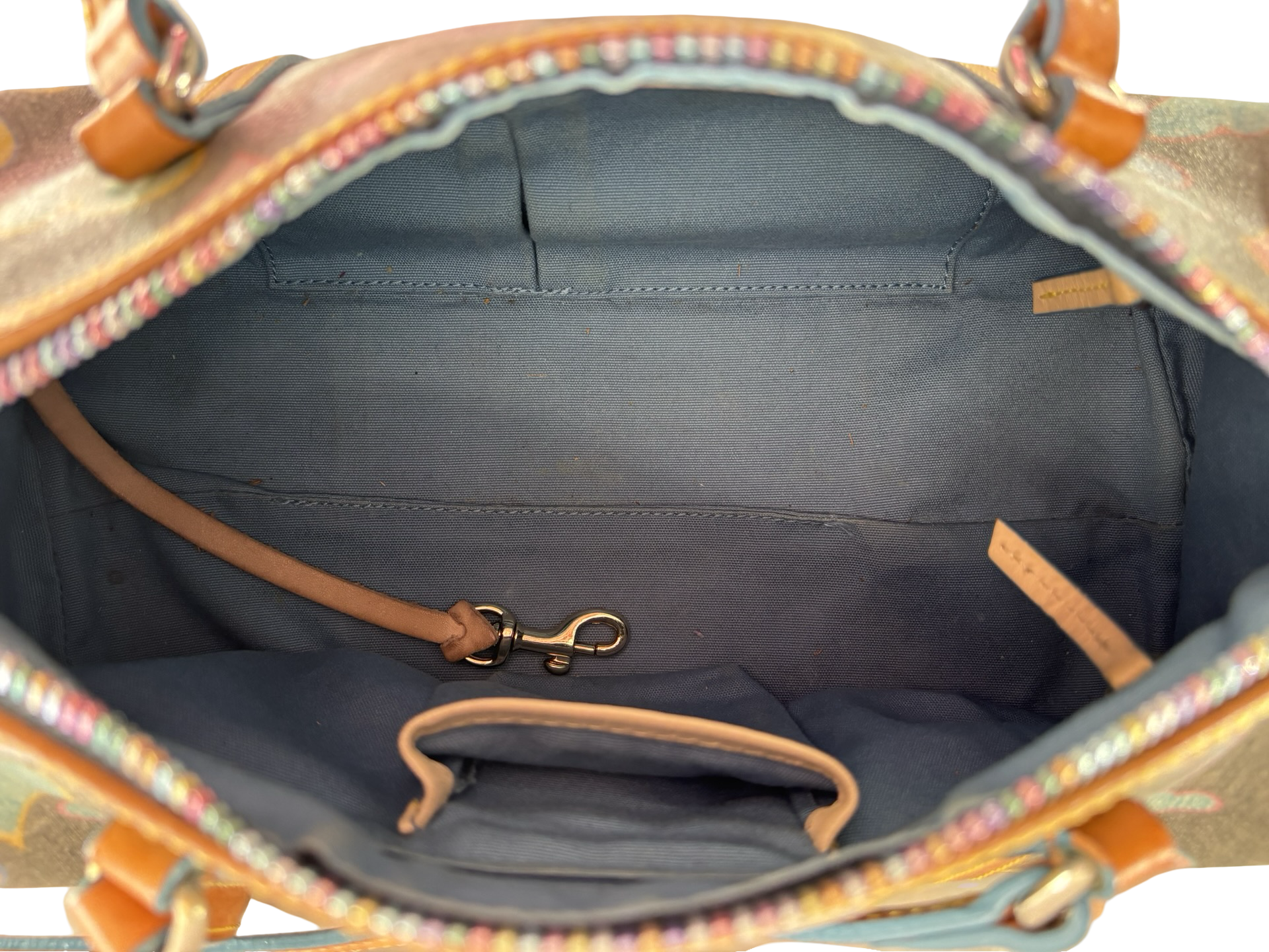 Designed with leather handles for durability and everyday comfort, the bag is finished with a colorful metal zipper and the signature Dooney & Bourke heart keychain charm that hangs from the zipper pull. The matching wristlet adds extra convenience and charm—perfect for cards, cash, or small essentials.