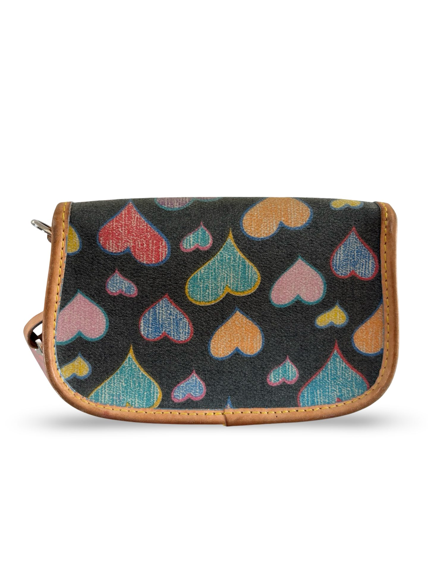 Fall in love with this rare Vintage Dooney & Bourke Heart Barrel Bag, complete with its original matching wristlet. This playful, Y2K-era classic features a sleek barrel silhouette, black exterior, and vibrant pink, purple, yellow, and blue heart print—a timeless statement piece for any collector or nostalgic fashion lover.